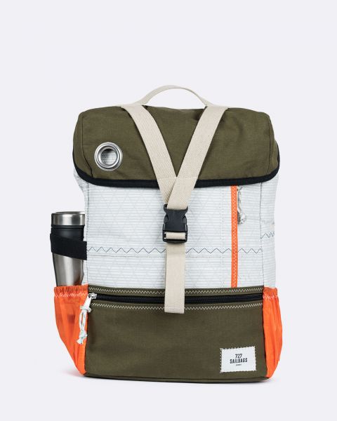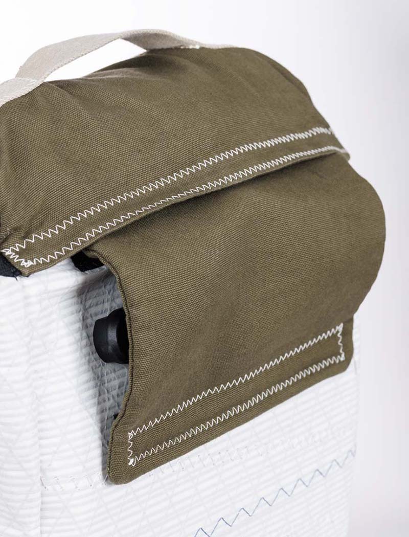 From the chosen sails, we worked for several months on the designs to create an elegant and functional bag: with a bottle holder, pockets and of course the eyelet and zig zag stitching that are the signature of 727 Sailbags.