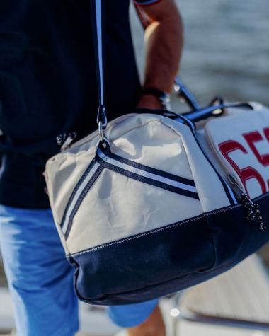 Fabriqué à partir de voile 100% recyclée et doté d'une base en tissu acrylique bleu marine, il offre une grande capacité pour transporter vêtements et équipements, rendant chaque voyage plus pratique.