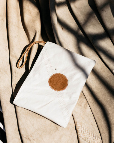 This elegant clutch bag is made of 100% recycled sail, and features soft leather details and robust zig zag stitching, symbol of the legendary three-masted ship.