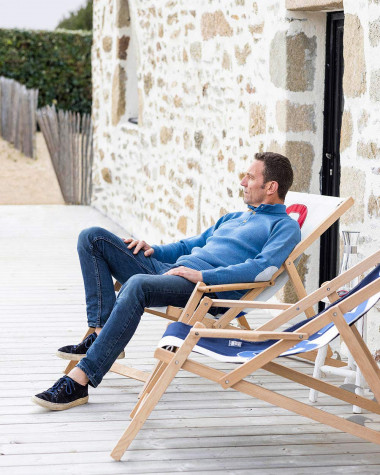 Whether it is for a sit down with a good book, a nap or a moment where time stands still, deckchairs are the most relaxing item of garden furniture. The sailcloth deckchair is designed from 100% recycled sailcloth. Authentic and unique, the sailcloth brings a breath of fresh air and a marine effect to your exterior. Strong and durable thanks to its tropical wood or oak structure, it will go with you wherever you go: on a balcony, on the beach, in a garden, beside the swimming pool…